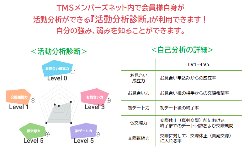 自己分析ツール+課題に特化したセミナーです。あなたが記録した活動実績の数値と他の会員データ等と比較して5つの項目がチャート表示されます。客観的な視点から判断されたスキルチャートとなっていますので、自分自身はどのスキルが不足しているかが確認できます。不足部分をTMSが開催するセミナーからセレクトし、スキルアップを目指すことができます。