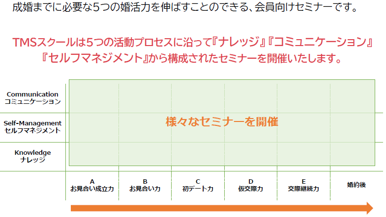 今日は成婚率をアップするための婚活塾(TMSスクール)のご案内です。婚活は日々悩みます。「どうすれば上手くいくのか?」「どういった会話をすれば良いのか?」「ファッションは?メイクは?髪型は?」「デートが上手くいくには?」当社では婚活が上手くいかず、お悩みの会員様に対して、プロによる「婚活塾」をご提案しています。