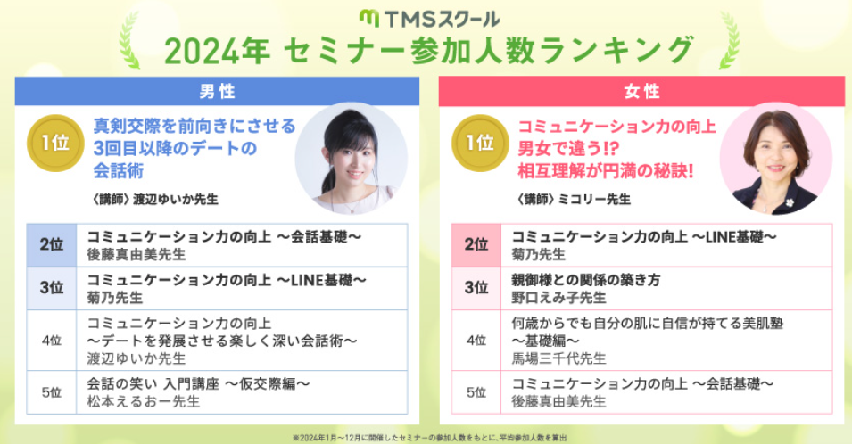 婚活セミナー「TMSスクール」2024年利用者の成婚確率が非利用者に比べて、45.3%アップ!2023年度実績を上回る結果に!TMSグループの結婚相談所にご入会いただいている会員様が、効率よく活動の改善方法を学ぶことができるサービス『TMSスクール』の2024年実績値が出ましたのでお知らせします。