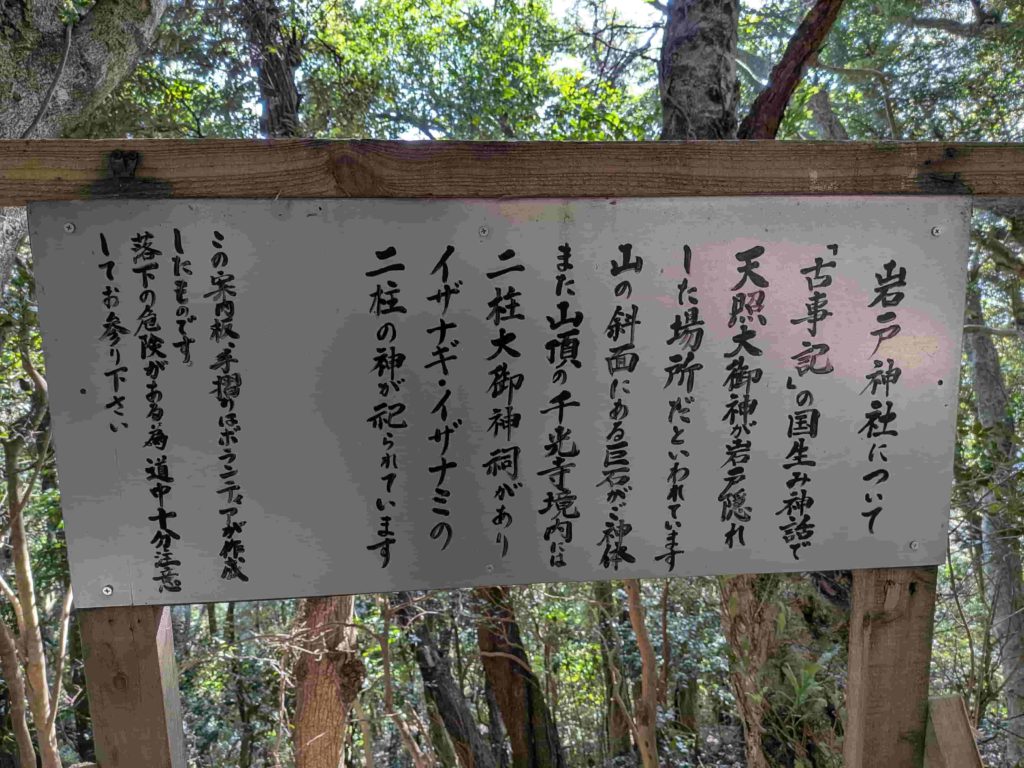岩戸神社の最大の見どころは、社の奥にどっしりと横たわる 高さ約8メートルの巨石(ご神体)。この石の中央には 大きな割れ目があり、淡路島の伝承ではそこに「天照大御神(あまてらすおおみかみ)」が隠れたと伝えられています。この看板までに来るまでも大変なのです(詳細は書いていませんが)