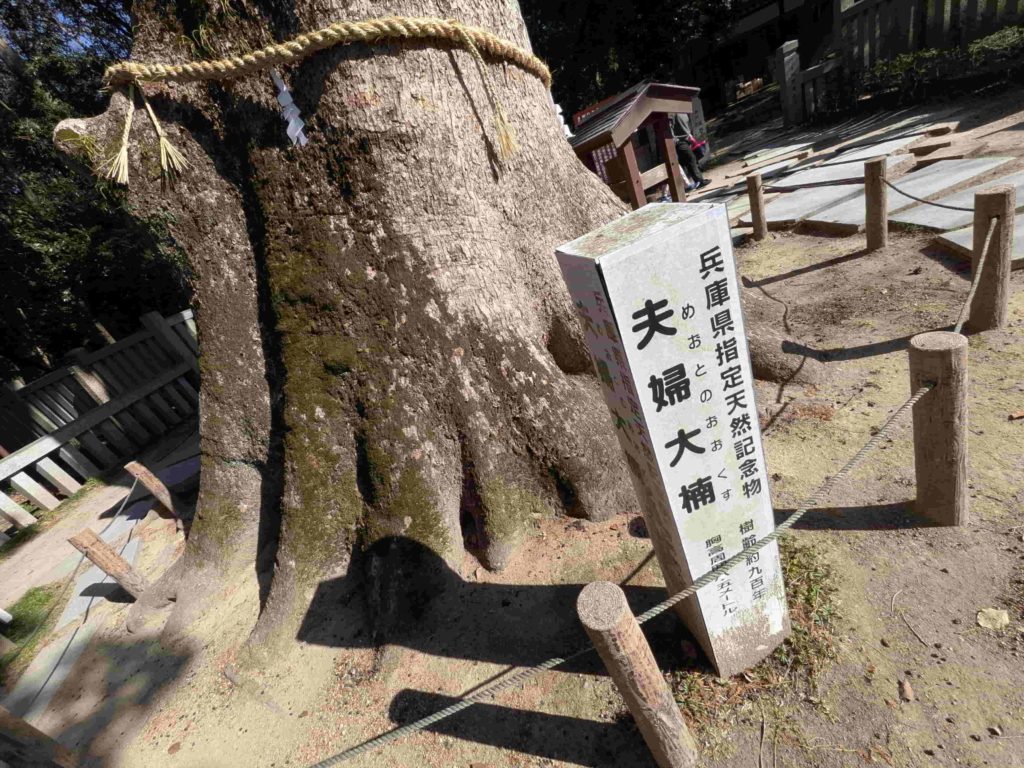 鳥居をくぐり、静かな参道を進んでいくと、境内の一角にそびえ立つ二本の大きな楠。根元でつながるように寄り添うその姿は、まさに“夫婦”そのものです。